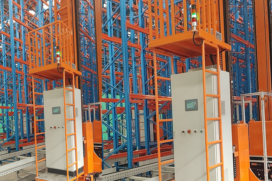 本方案總貨位2688個(雙深位2個巷道,8排28×2列6層),高度9.6m。全套設備由1臺轉彎式雙立柱有軌巷道堆垛機,雙深位雙電機貨叉,4臺鏈條機,5臺輥道機和2臺移載機;2個入庫輥道機中部安裝1套外形檢測裝置、1套稱重裝置和1只固定式條碼掃描器。全部實現自動化處理。